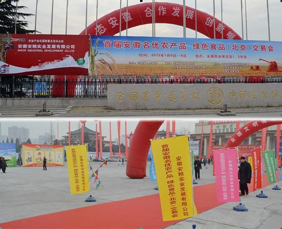 本次農(nóng)交會(huì)由安徽省人民政府主辦的,為期三天,其主題為“生態(tài)安徽、合作發(fā)展、創(chuàng)新崛起”,來(lái)自全省16個(gè)地市的優(yōu)秀農(nóng)產(chǎn)品企業(yè)以及省級(jí)農(nóng)民合作示范社共760家齊聚一堂。位于全國(guó)農(nóng)業(yè)展覽館正門(mén)上方的安糧實(shí)業(yè)大幅廣告牌以及廣場(chǎng)上印有公司名稱的彩旗格外引人注目。