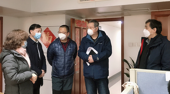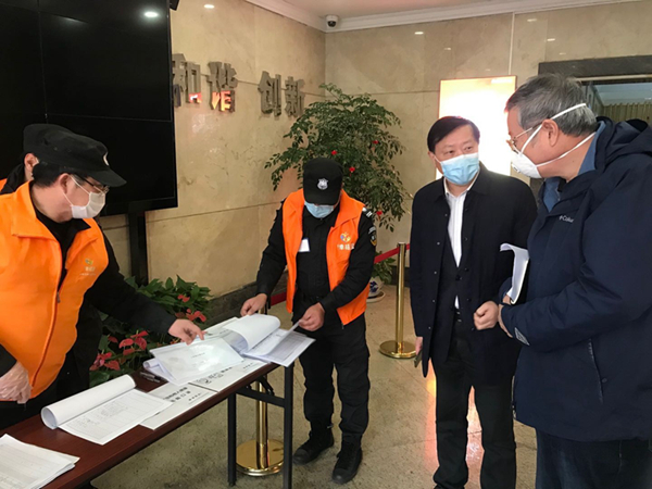 在盛安廣場一樓大廳,包總一行主動接受體溫測量和登記,現(xiàn)場檢查了測溫、消毒及人員進出登記工作,聽取了現(xiàn)場工作人員的情況匯報,對他們的辛勤工作表示慰問和感謝,充分肯定了公司疫情防控工作。