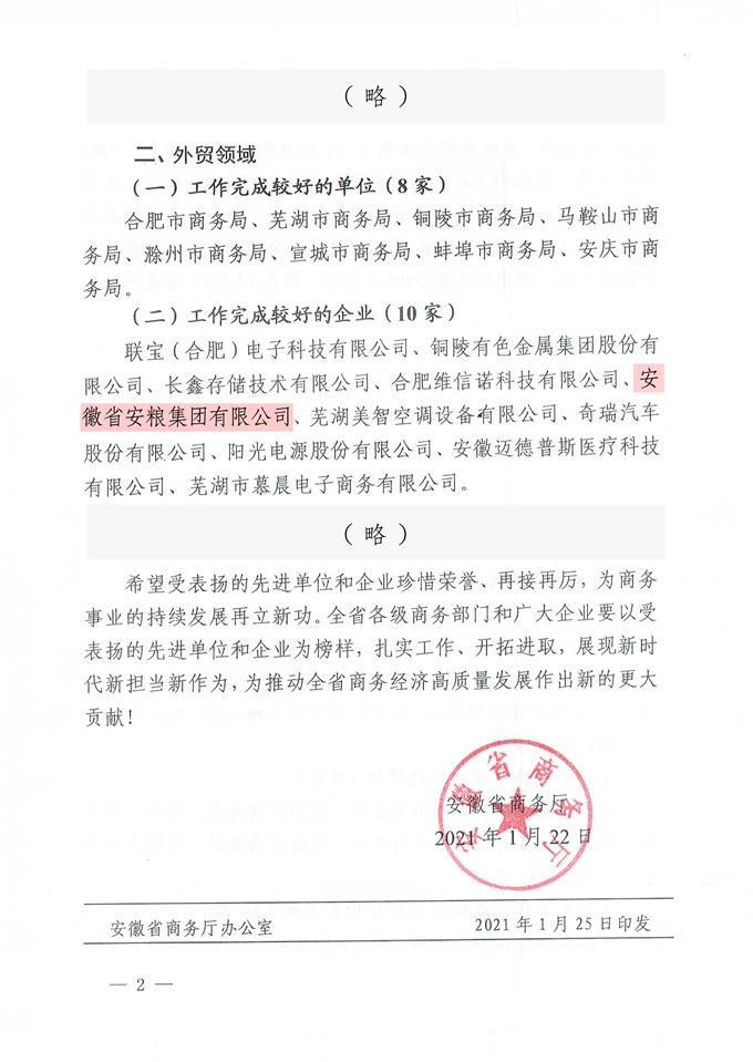安糧集團(tuán)2020年以進(jìn)出口額超22.46億美元(海關(guān)統(tǒng)計(jì)),增速超28.56%的業(yè)績,作為省內(nèi)唯一一家入圍的專業(yè)外貿(mào)公司榮獲省商務(wù)廳的表彰。