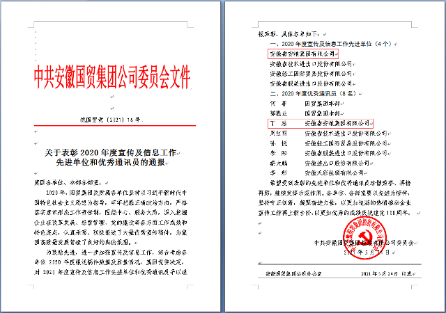 安糧集團榮獲國貿集團2020年度宣傳及信息工作表彰