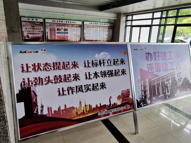 (一樓大廳立標(biāo)語,建工人擼起袖子加油干)
