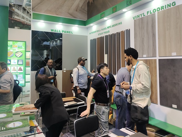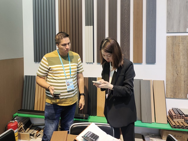 建材展位重點(diǎn)推出了墻板,格柵,樓梯踏板以及木塑戶外地板等新產(chǎn)品,從室內(nèi)到戶外產(chǎn)品一應(yīng)俱全。參展部門根據(jù)對去年秋季交易會的考察分析以及近期客戶最新詢盤情況的整合梳理,積極開拓更新參展產(chǎn)品。結(jié)合國外最新流行的趨勢,推出了拼花木紋,石紋等當(dāng)下十分暢銷的花色。利用立體燈箱,將產(chǎn)品優(yōu)勢,產(chǎn)品結(jié)構(gòu)剖面等信息直觀展示,讓客戶更加清晰地了解產(chǎn)品的性能和優(yōu)點(diǎn),吸引諸多專業(yè)買家的觀看和洽談。此外,在攤位新增產(chǎn)品拼裝的體驗(yàn)區(qū),增加產(chǎn)品小樣及配件的DIY拼裝,吸引客戶自己動手,大大提升了參與度和體驗(yàn)感,讓客戶真切地感受到安糧的誠意與新意。