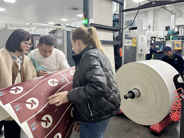 (業(yè)務員和客戶在紙杯印刷車間對紙杯印刷進行確認)