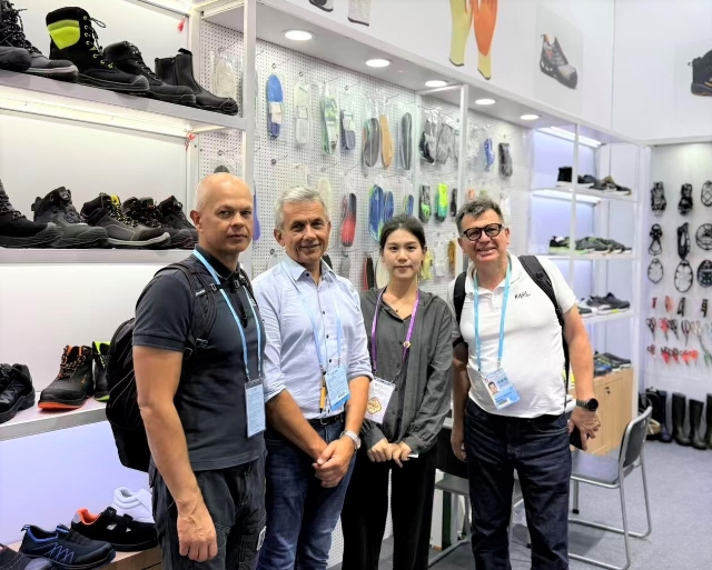 在工具類展區(qū),安糧在常規(guī)安全鞋產(chǎn)品基礎(chǔ)上,新增勞保手套、多功能剪刀、冰爪、反光材料等多款新產(chǎn)品,全面覆蓋戶外安全防護(hù)場景,凸顯“專業(yè)性”與“全面性”雙重優(yōu)勢。為讓客戶直觀感受產(chǎn)品品質(zhì),展區(qū)采用原木色層板與洞洞板靈活組合的裝修設(shè)計,方便客戶觸摸、體驗產(chǎn)品的材質(zhì)、工藝與功能,如拉扯勞保手套的耐磨度、體驗多功能剪刀的剪切效果、查看反光材料在模擬黑暗環(huán)境下的警示亮度。目前已有來自法國的戶外用品品牌商提出樣品寄送需求,另有來自智利的的安全防護(hù)設(shè)備經(jīng)銷商明確表達(dá)長期合作意向。